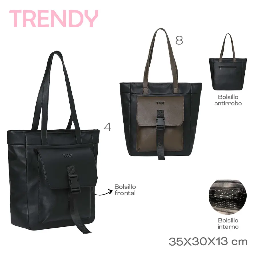 CARTERA ANTIRROBO MUJER TRENDY ECO CUERO. · Amplio compartimiento principal. · Confeccionada en Eco Cuero. · Un bolsillo posterior antirrobo. Cartera de Mujer Trendy - Amplio compartimiento Principal - Interior forrado - Cierre Reforzado ¡Lleva todas tus cosas protegidas! La más Segura, Ultra Liviana y Resistente - Diseño cómodo y a la moda, elegante ideal para tus salidas o paseos. · Cartera de Mujer Antirrobo Trendy. · Un bolsillo interno con cierre. · Bolsillo frontal con solapa y broche de seguridad. · Interior forrado con el logo de la marca. · Dos asas de transporte. · Cierres reforzados. · Zippers metálicos. · Resistente y liviana. · Logo frontal Trendy. · Diseño cómodo y a la moda. · Elegante, ideal para tus salidas o paseos. · Medidas: Alto 35cm x Ancho 30cm x Prof. 13cm.
