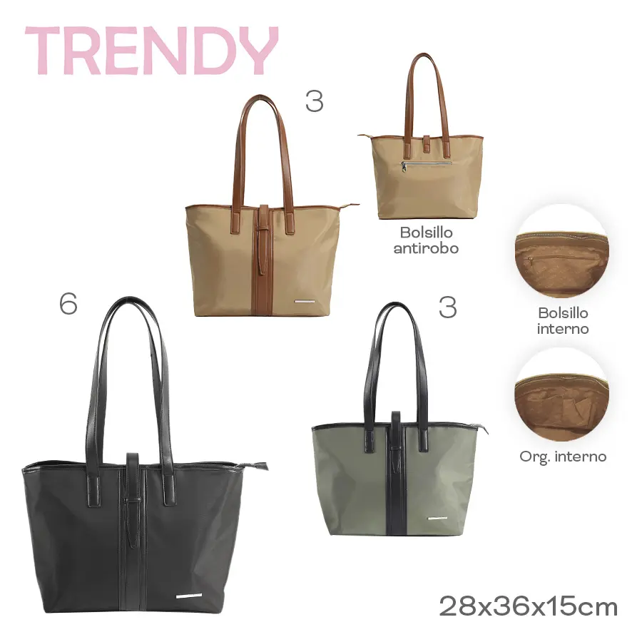 CARTERA TOTE ANTIRROBO MUJER TRENDY ECO CUERO. · Amplio compartimiento principal. · Confeccionada en Poliéster y Eco Cuero. · Bolsillo posterior antirrobo. · Organizadores internos. Cartera de Mujer Trendy - Amplio compartimiento Principal - Interior forrado - Cierre Reforzado ¡Lleva todas tus cosas protegidas! La más Segura, Ultra Liviana y Resistente - Diseño cómodo y a la moda, elegante ideal para tus salidas o paseos. · Cartera Tote Mujer Trendy. · Material resistente anti desgarre. · Dos asas superiores de transporte ajustables. · Cierres reforzados. · Zippers metálicos. · Interior forrado con logo de la marca. · Resistente y liviana. · Ideal para su uso diario. · Lleva todas tus cosas protegidas. · Medidas: Alto 28cm x Ancho 36cm x Prof. 15cm.