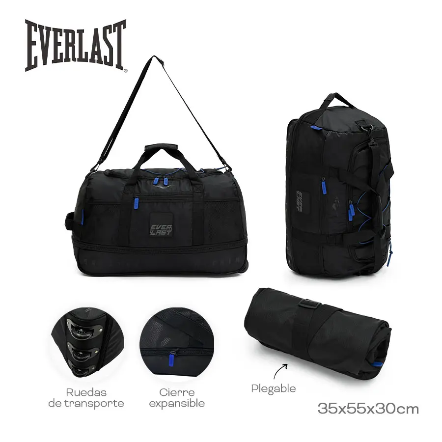 Descripción: Material: poliéster. Capacidad: 60L. Con correa de hombro ajustable. Medidas: 35cm de alto x 30cm de profundidad x 55cm de ancho. Con ruedas. Es plegable.