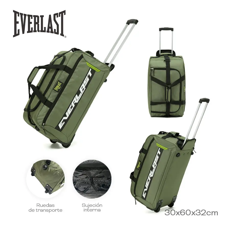 El Bolso Carro Everlast para Viajes es la solución ideal para quienes buscan comodidad y funcionalidad en sus desplazamientos. Con un diseño práctico y moderno, este bolso cuenta con dos ruedas que facilitan su transporte, permitiéndote llevar tus pertenencias de manera sencilla y sin esfuerzo. Su estructura plegable lo convierte en un compañero versátil, perfecto para viajes deportivos o escapadas de fin de semana. Fabricado en poliéster resistente y a prueba de agua, este bolso asegura la protección de tus objetos personales en diversas condiciones climáticas. Con un amplio espacio de almacenamiento y tres bolsillos adicionales, podrás organizar tus pertenencias de manera eficiente, manteniendo todo al alcance de tu mano. Sus dimensiones de 60 cm de ancho, 30 cm de alto y 32 cm de profundidad ofrecen una capacidad adecuada para llevar todo lo necesario sin complicaciones. El Bolso Carro Everlast es un accesorio sin género, diseñado para adaptarse a las necesidades de cualquier persona que valore la funcionalidad y el estilo. Su cierre tipo zipper garantiza la seguridad de tus objetos, mientras que la correa de hombro ajustable permite un transporte cómodo. Este bolso es la elección perfecta para quienes buscan un producto duradero y práctico para sus aventuras deportivas y de viaje.
