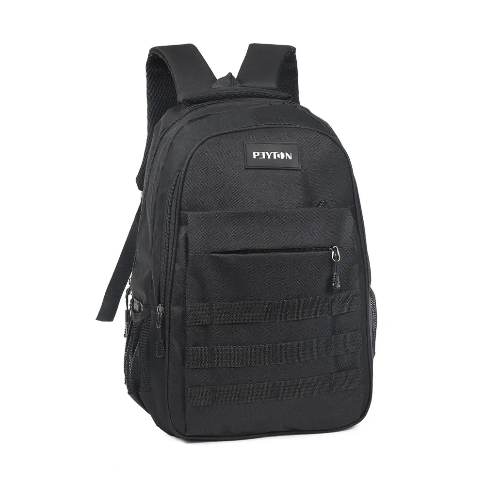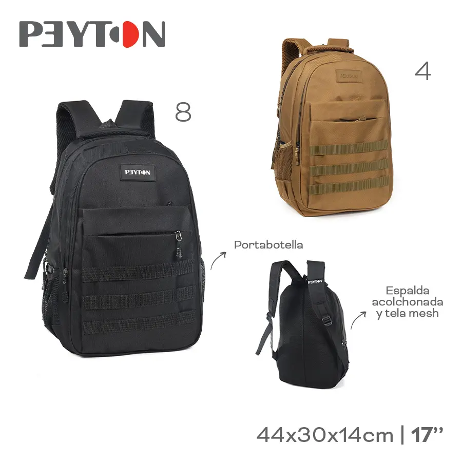 MOCHILA URBANA CAMPING TACTICA PEYTON. · Amplio compartimiento Principal. · Bolsillos Frontales con Cierre. · Bolsillos Laterales de Red porta Botellas. · Cierres Reforzados. Tiras Acolchadas, para el cuidado de tus hombros - Espalda Acolchada, Lleva tus cosas protegidas ¡La mochila más Segura! · Tiras Ajustables Acolchadas Air Mesh. · Asa Superior Air Mesh. · Mochila Liviana y Reforzada. · Espalda acolchada con Sistema Air Mesh. · Sistema Molle. · Tela Anti Desgarre. · Medidas 43cm x 30cm x 18cm.