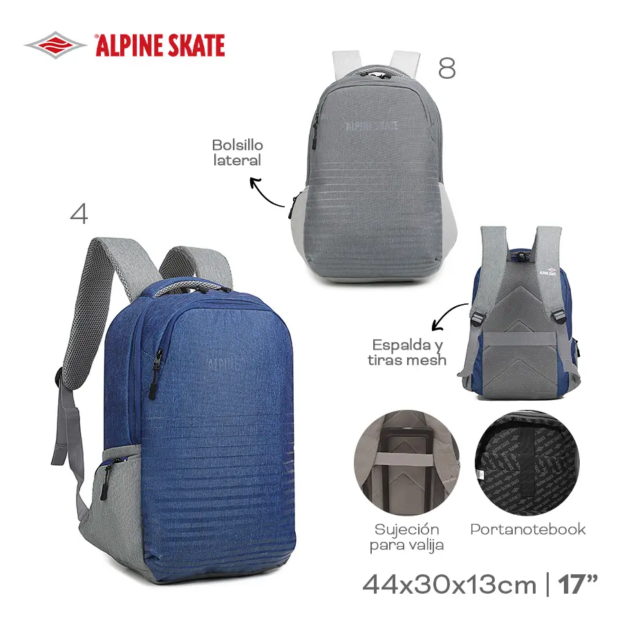 Mochila 17 pulgadas- ALPINE SKATE bolsillo lateral, espalda y tiras mesh, sujeción para valija, portanotebook Composición: cordura Alto: 44 cm Ancho: 30 cm Profundidad: 13 cm