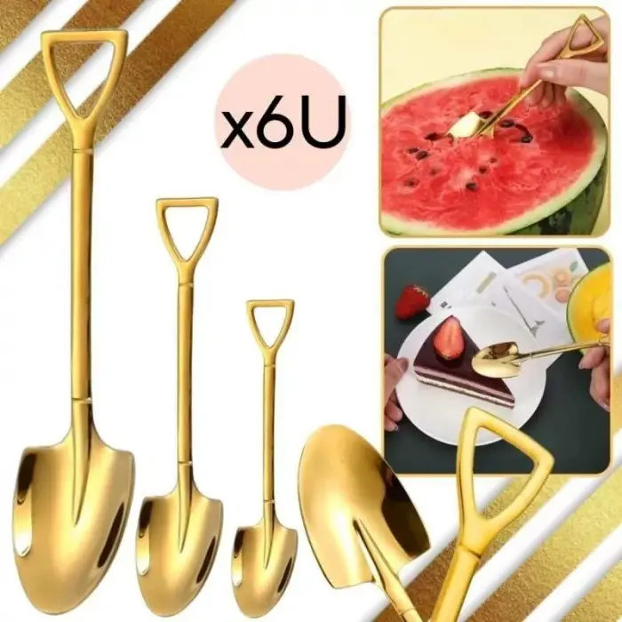 El precio corresponde a 6 cucharitas de te en forma de pala!Material: Acero inoxidableEl set incluye: 6 cucharitas de diferentes medidas2Ud de la medida 17,5CM2Ud de la medida 15,5CM2Ud de la medida 12,5CM