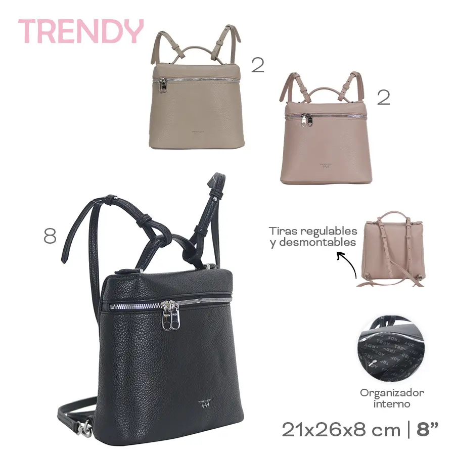 Mochila TRENDY para mujer, confeccionada en Pu de gran calidad, totalmente forrada en su interior, con un bolsillo interno y un organizador en su interior contiene correas regulables y extraibles. Excelentes detalles y terminaciones según imagen. Pack por unidad Medida 21cm x 26cm x 8cm